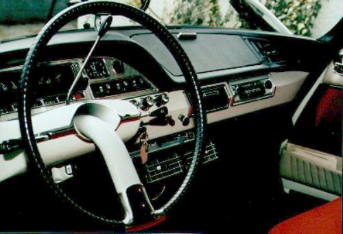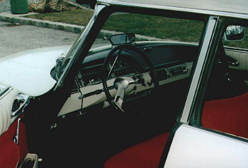 ![]() Armaturenbrett nach Klimaanlageneinbau mit den beiden Belüftungsdüsen in der Mitte; Klimaanlagen der damaligen Zeit wälzten lediglich die Luft im Fahrzeuginneren um und hatten keine Frischluftzufuhr. Für den Luftaustritt waren eigene Düsen vorgesehen, da die Klimaanlagen nicht in das bestehende Belüftungssystem integriert waren |